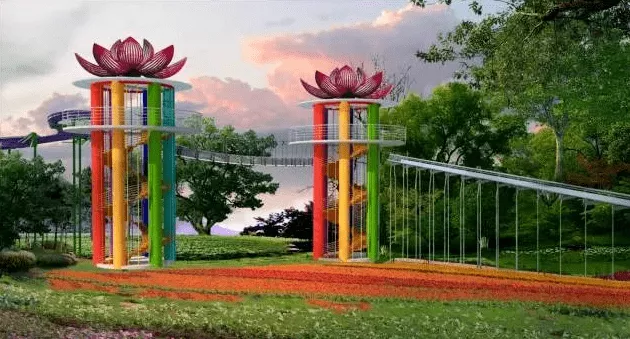 36项多面高空活动场地,包含攀岩、断桥、高空桥、天梯、速滑等活动项目。