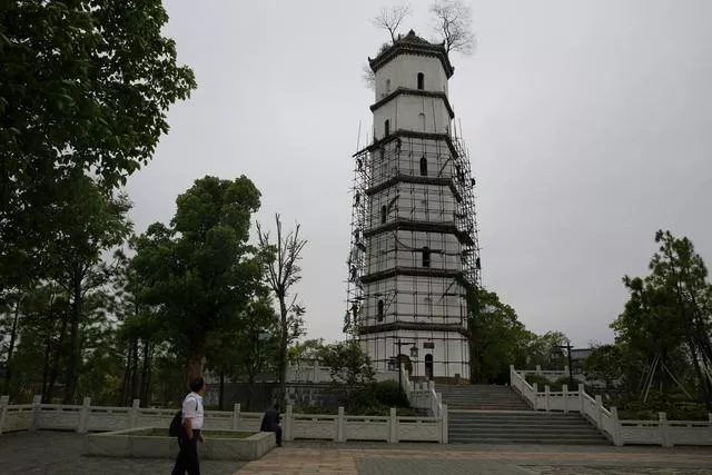 塔身底部曾在抗日战期间被日寇飞机炸毁一角墙脚,维修仍然留着这块“伤疤”,我想,是让人们记住这段历史。