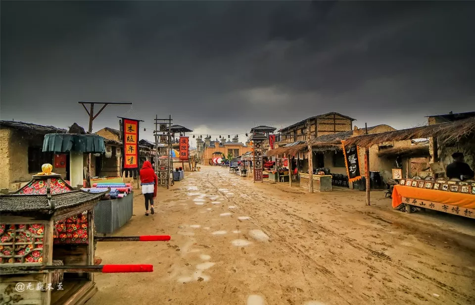 大名鼎鼎的国家5A景区镇北堡西部影城距银川市约35公里,走进西部影城,滚涌的乌云已迫不及待地翻滚上场、用专业的精神持续跑着龙套为游客烘托气势,顷刻间黄豆大的雨点在电闪雷鸣下倾泻而来,呵!果然是《大话西游》降妖伏魔的好所在!幸好景区内的牛拉车、驴拉车还可以避雨,只不过萌萌哒的驴仔仔浑身淋透让人很是过意不去!
