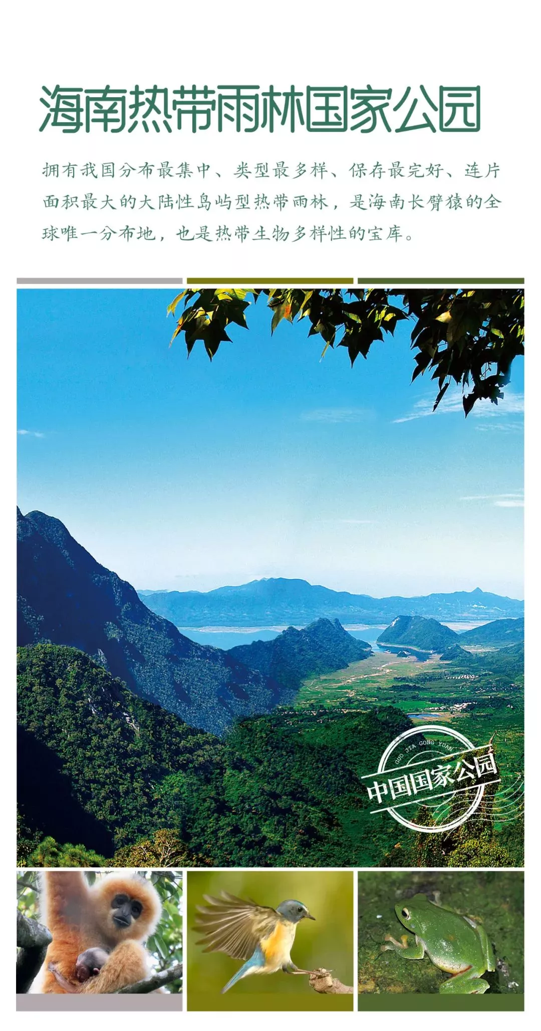 简介:海南热带雨林国家公园位于海南岛中部,这里是全球最濒危的灵长类动物——海南长臂猿唯一分布地,是热带生物多样性和遗传资源的宝库,成为岛屿型热带雨林珍贵自然资源传承和生物多样性保护典范。
