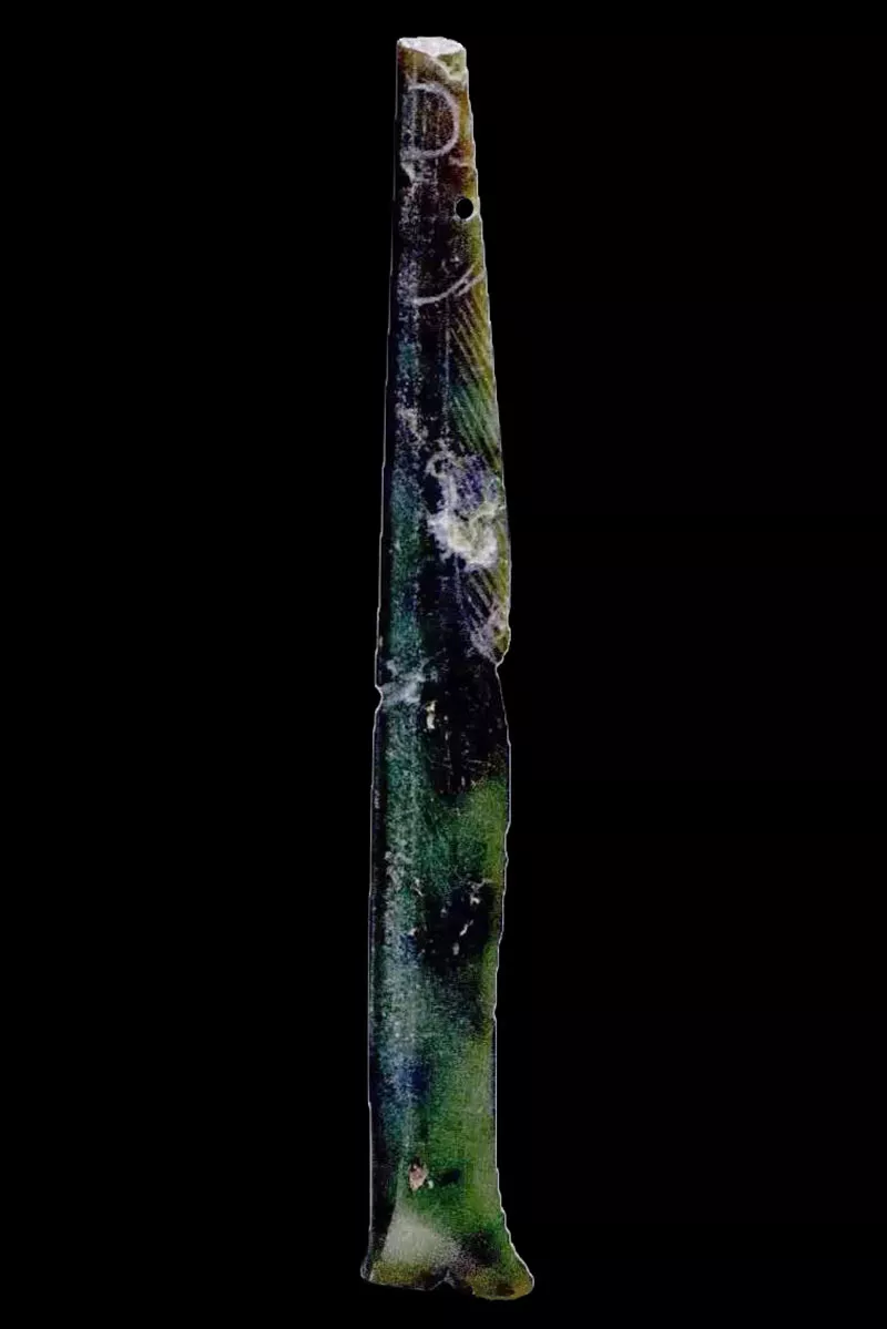 6.玉牌,保存完整。灰绿色,末端有白褐斑。器身较薄,呈长方形牌状,上宽下窄,顶端有一组犬牙状扉棱,两侧各有两组犬牙状扉棱,末端呈部规则尖状,一侧边有两个犬齿状缺口。牌身两面阴刻纹饰形制相同,均为方向相反的一鸟一龙纹,鸟纹在上,靠近柄首,钩啄,平嘴,圆晴,头有花冠,扬翅,卷分尾,尾羽由身后向上卷至头前,胸下有硕大鸟爪。龙纹在下,靠近柄末,卷鼻,张口,口下有短须,《臣》字形眼,顾首,身曲折,尾下垂。长5.9厘米。