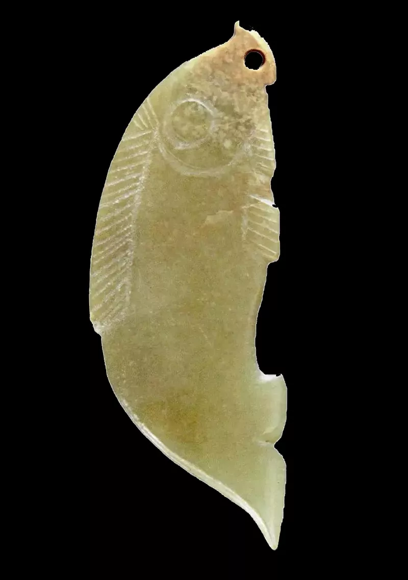 9.玉鱼,保存完整。青黄色,材质较通透。整体呈扁平片状卷体。阔嘴,形体斜直微弧。头部近吻处有一对双面穿孔。背部圆弧,尖端后扬。分尾下垂,两面阴刻圆晴、一圆弧状腮、一背鳍、兩腹鳍线。长5.1厘米。