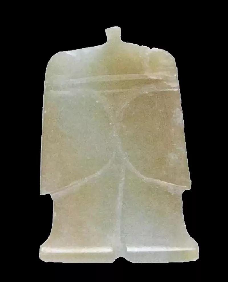 10.玉鱼,保存完整。灰白色,材质通透度差。整体呈扁平片状曲体。鱼阔嘴,斜弧、尖端上扬,头近顶部由一单面斜穿孔。鱼背、腹圆弧。三分尾圆弧且下垂。两面阴刻圆形眼、一圆弧状腮、一背鳍、一腹鳍线。长6.9厘米。